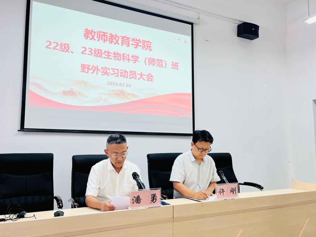 2024年7月2日,太阳集团tyc151cc在博学楼3栋138召开2022级、2023级生物科学(师范)班野外实习动员大会,经理潘勇、副经理许刚、系主任杨俊年、专业课老师沙爱龙、钟彦、辅导员冯梅、邓峥嵘及2022级、2023级生物科学(师范)班全体员工参会。大会由副经理许刚主持。