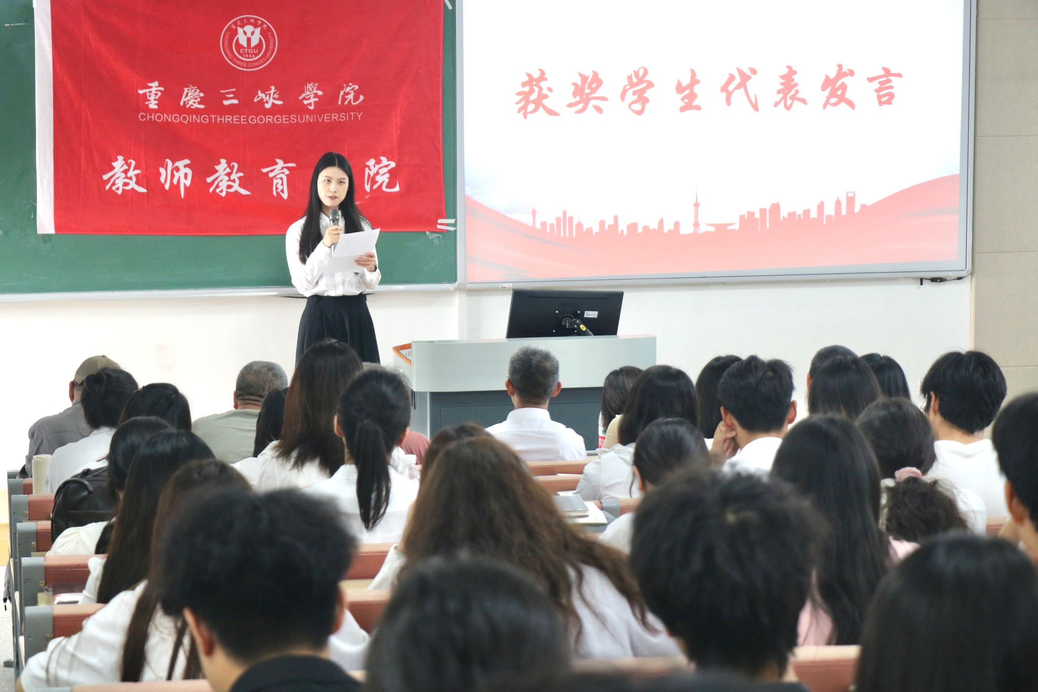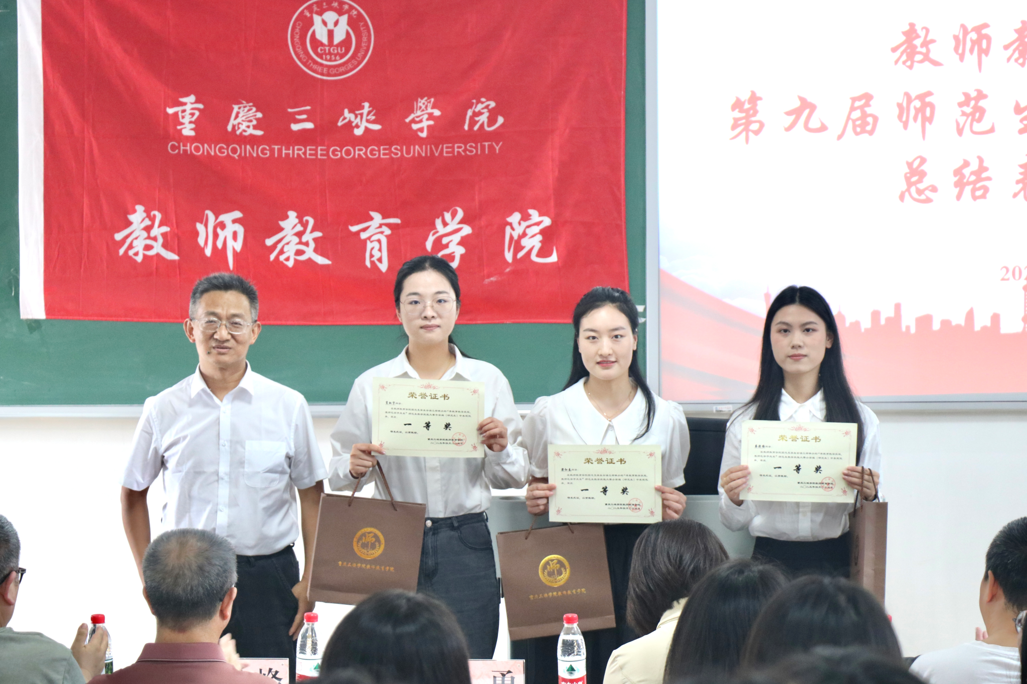 副经理蒋文峰宣读了表彰名单。本届大赛共有59名选手参赛,经过激烈角逐,48人晋级决赛。最终,小学教育研究生组和本科生组各评出一等奖2名、二等奖4名,三等奖6名;中学教育研究生组评出一等奖1名,二等奖2名,三等奖3名;中学教育本科生组评出一等奖3名,二等奖6名,三等奖9名。与会领导及教师依次为获奖选手颁发荣誉证书并合影留念。