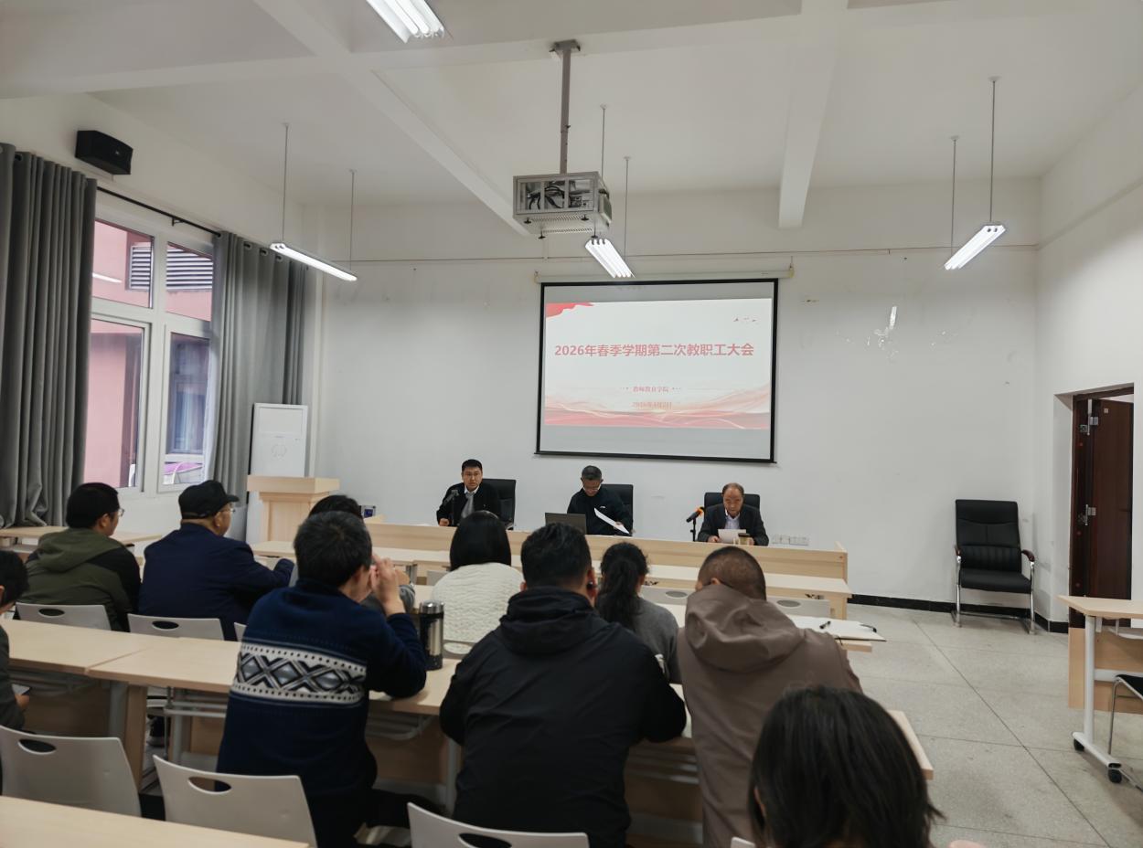 2026年4月2日,太阳集团tyc151cc在博学楼3栋138会议室召开2026年春季学期第二次教职工大会暨政治理论学习会,会议由副经理黄成毅主持,全体教职工参会。