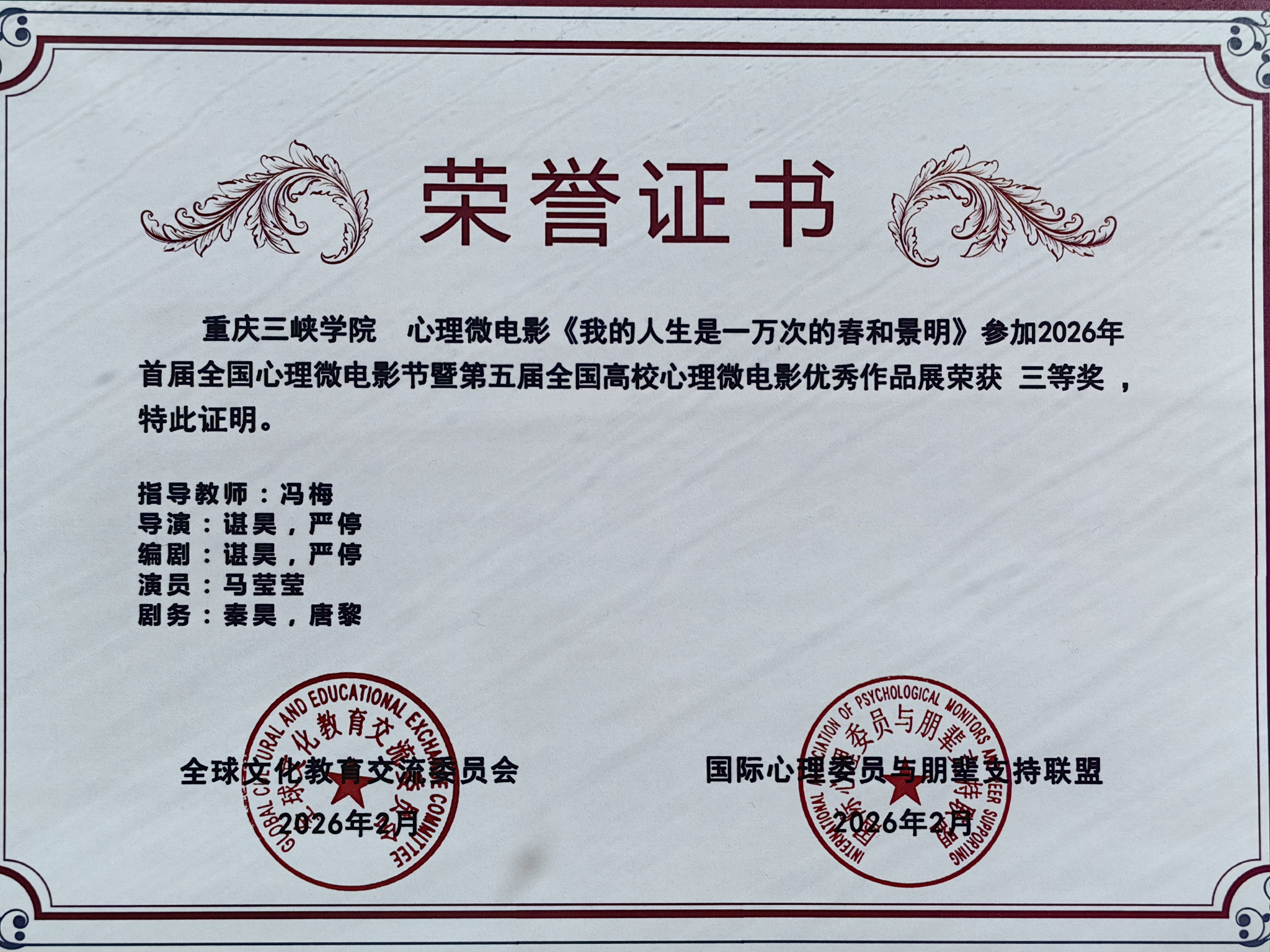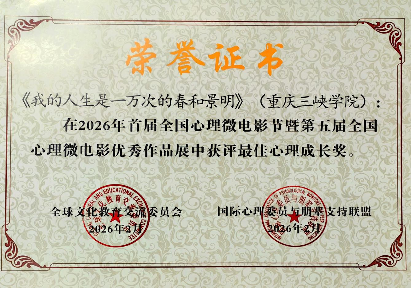 2026年2月6日至7日,首届心理微电影节暨第五届全国心理微电影优秀作品颁奖仪式在深圳举行。由太阳集团tyc151cc心理专干冯梅老师指导,2023级员工谌昊担任主创的心理微电影作品《我的人生是一万次的春和景明》荣获大赛三等奖,并荣获最佳心理成长奖。